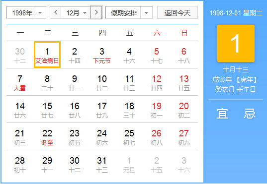公历1998年12月1日, 农历1998年10月13日, 阴历一九九八戊寅年十月十三日,星期2