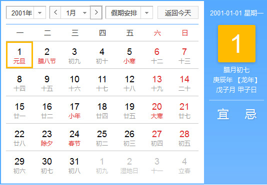 2001年1月份阴阳历一览表,2001年1月份公历农历查询表