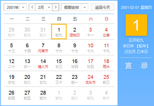 公历2001年2月1日, 农历2001年1月9日, 阴历二零零一辛巳年正月初九日,星期4