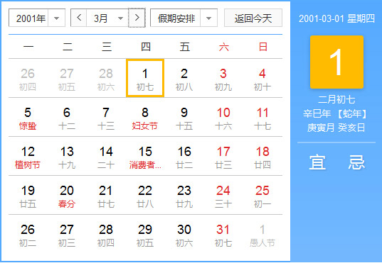 公历2001年3月1日, 农历2001年2月7日, 阴历二零零一辛巳年二月初七日,星期4