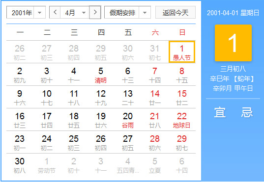 2001年3月份阴阳历一览表,2001年3月份公历农历查询表