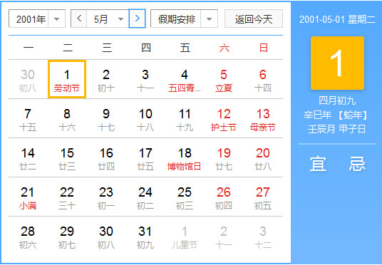 2001年5月 农历辛巳(蛇)年壬辰月 建国52年