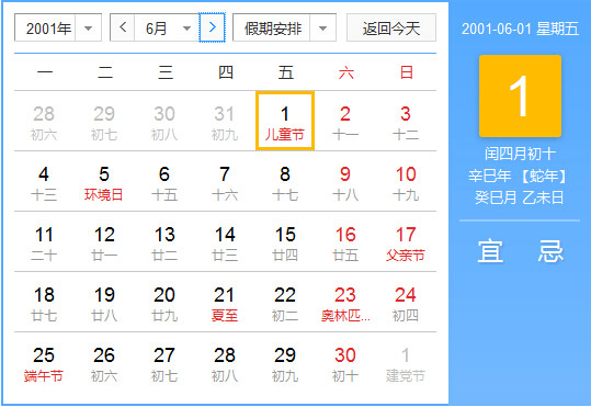 2001年6月 农历辛巳(蛇)年癸巳月 建国52年