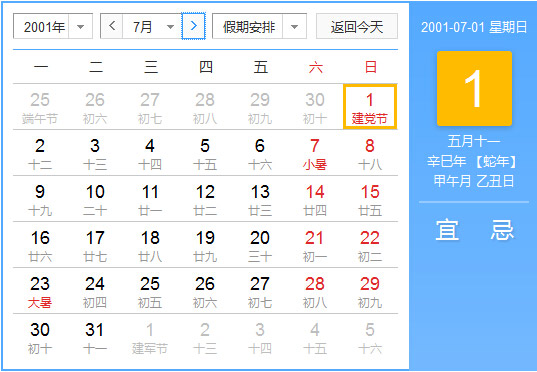 2001年7月 农历辛巳(蛇)年甲午月 建国52年