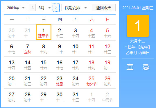 2001年8月 农历辛巳(蛇)年乙未月 建国52年
