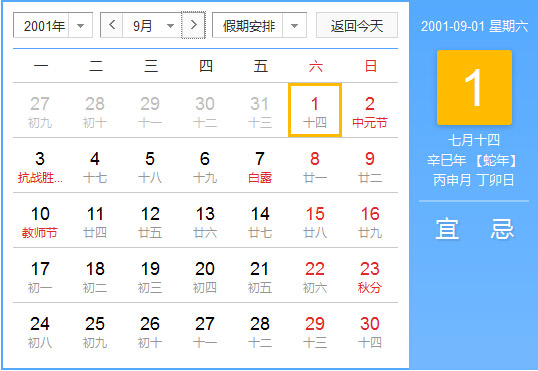2001年9月 农历辛巳(蛇)年丙申月 建国52年