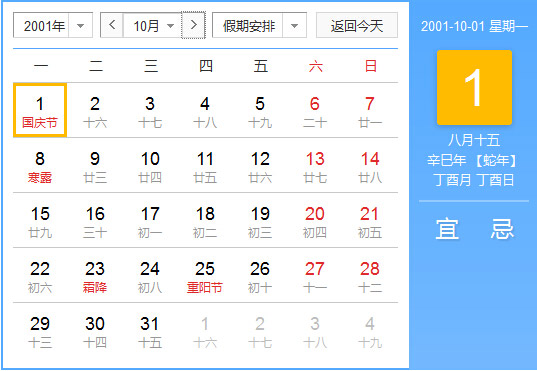 2001年10月 农历辛巳(蛇)年丁酉月 建国53年