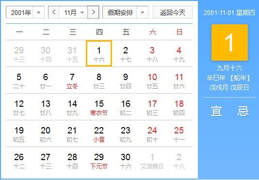 公历2001年11月1日, 农历2001年9月16日, 阴历二零零一辛巳年九月十六日,星期4