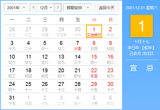 公历2001年12月1日, 农历2001年10月17日, 阴历二零零一辛巳年十月十七日,星期6