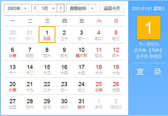 2003年1月份阴阳历一览表,2003年1月份公历农历查询表