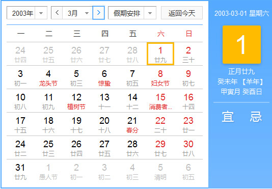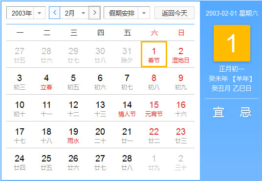 2003年春节是什么时候:2003年2月1日 星期六 农历 正月初一