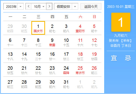 公历2003年10月25日, 农历2003年10月1日, 阴历二零零三癸未年十月初一日,星期6