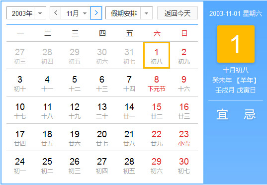 2003年11月份阴阳历一览表,2003年11月份公历农历查询表