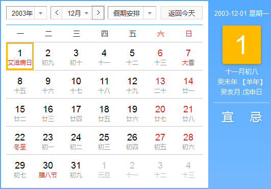 公历2003年12月1日, 农历2003年11月8日, 阴历二零零三癸未年十一月初八日,星期1