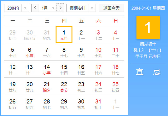 公历2004年1月1日, 农历2003年12月10日, 阴历二零零三癸未年十二月初十日,星期4