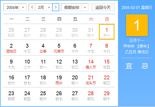 公历2004年2月1日, 农历2004年1月11日, 阴历二零零四甲申年正月十一日,星期7