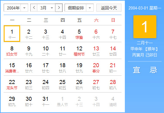 公历2004年3月1日, 农历2004年2月11日, 阴历二零零四甲申年二月十一日,星期1