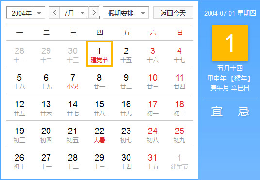 2004年7月 农历甲申(猴)年庚午月 建国55年