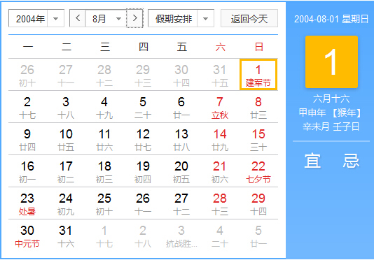 2004年8月 农历甲申(猴)年辛未月 建国55年