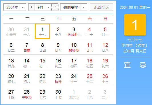 公历2004年10月17日, 农历2004年9月4日, 阴历二零零四甲申年九月初四日,星期7