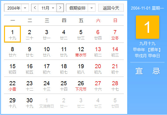 公历2004年11月1日, 农历2004年9月19日, 阴历二零零四甲申年九月十九日,星期1