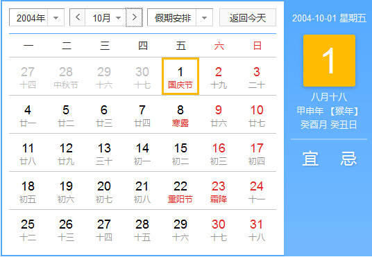 公历2004年10月18日, 农历2004年9月5日, 阴历二零零四甲申年九月初五日,星期1