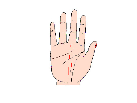 命运线起自手腕附近直至中指根部,成一直线,(记号B)表示运气与性格均至坚强,这类人具有一股强力,足以贯彻宿愿以显示其权势。女性具此相的人,大致很好胜,如果太阳线也和它拼立,便表示在社会第一线活跃;相反,如无太阳线拼起,便是虚有其表而不努力,只会寄人篱下,为人作嫁衣,自己不得其志,大凡此种直立线总是表示性格坚强,劳碌辛苦。