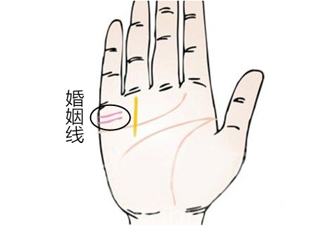 婚姻线又名(爱情线、结合线)在水星丘侧(小指根部掌边),感情线上方,所刻划的短短横线,有时出现几条,但以最长最明显的一条为准,这条线不但表示结婚运,也可以看出恋爱或色情关系,不过,除本线外尚须参考其它部分,决不可因结合线不好,便一口断定结婚运欠佳。要知结婚运必须有健康,金钱,智慧互相配合,同时还得遇到机会,因此务必要参照感情线,智慧线,生命线三大线条,才能预知结婚或与异性之关系。