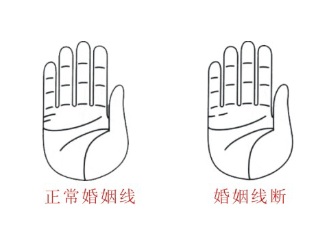 婚姻线上或下出现短线。表示此人感情不顺利,多争吵,脾气倔。容易得病,特别是女性婚后容易得妇科炎症如盆腔炎、附件炎、输卵管疾病。男士婚后容易的前列腺炎。