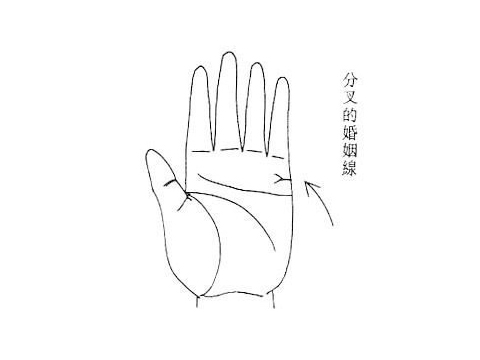婚姻线在开始处分叉成两线然后又合而为一,深深地刻画出来,表示有两异性追其人,上叉线表示成功者,下为插入者。