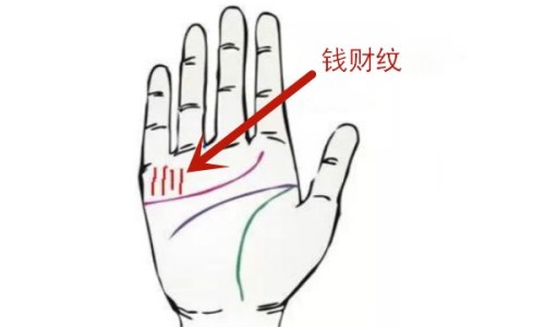 手掌摊开后,小指根部(位于手掌八大宫位的坤宫水星丘的区域),出现细小的斜线就是钱财纹。大多数人都有这类线纹,但财运好坏和多寡就得看这类纹路线条的数量以及外形和深浅等。如果这区域的斜线呈现龙须状,而且有多条清晰深的(类似玉米须,细而多),财运很好,善于经营和掌控钱财规划,容易大富大贵。如果钱财纹不明显或极少,难以抓住机遇,所以要懂得变通,多积极也是能获得财富的。