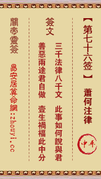 三千法律,指的是罪状条文,八千文,是指律文的内容,这是一般凡人无法了解,也不能事先知道,未来的吉凶,完全决定在现在所为的善恶,神佛无法为你多祈求福份,只有自己的修为才能影响吉凶,一生的祸福都由自己所作为的善恶决定,非他人能决定。此签神明无法有所帮助,未来祸福早已决定在自己,求福避祸,倒不如去恶行善。此签的吉凶完全在各人作为。