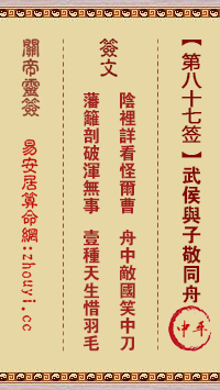 占得此签,表示先凶后吉,凡事要和同,可免是非。问诉讼,宜和解。问婚姻,恐有变。问财利,宜防暗箭,小人侵害。