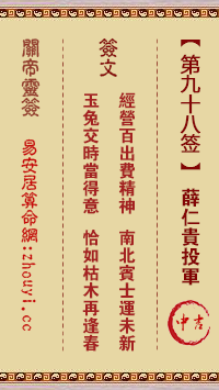 耗费精神在经营事业上,总是毫无头绪,即使辛勤地南北奔波,也是无济于事,必须等到卯年月日,才得以转机,此时才能渐渐顺遂,犹如干枯的树木,每到春天的时候,依然能发出新芽,犹如重生。此签表示必须经过一番辛勤的努力及失望,直到适当的时机,才得以扬眉吐气,时机未到,做任何的努力都是无济于事,时机到了,有水到渠成之势,晚景运势亨通。