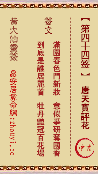 唐朝天宝年间,玄宗李隆基在位时,可称全盛时代,所谓花开富贵,唐天宝是也,当时,世人甚爱牡丹,以之喻意富贵吉祥。签载满园春花斗开得好样,到底以牡丹花为第一,此签有一种庆闹景象,凡事俱皆平稳无碍也。