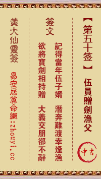 伍员,即伍子婿,昔伍子婿,春秋战国楚人也,父兄被楚平王杀害,楚王追杀伍员,他避难奔至江边,被江水阻隔,前无去路,后有追兵,幸有一渔舟救之渡江,伍子婿感激之馀,坚持要将自己之剑赠于渔父,渔父不受,以此大义相交,故辞剑也,求得此签者,凡事不可有贪心,有益于人之事,无论人之知与不知,人之报与不报,力到便做,讲义不讲财可也,以签论,凡事平稳无碍,此凶中有吉之签也。