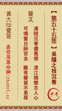 古人吴隐之,来广东作官,爱护子民,两袖清风,及辞官回家,人民感其德政,纷纷赠以礼物,隐之不接受,只受一沉香扇坠,及乘舟离任,风浪大作,隐之祷告天地,将该沉香扇坠投于水,以示清廉,果然风平浪静,一路平安达家园,后人因此称该处为沉香浦,渡江者每追念当年隐之之清廉,求得此签者,凡事平稳,须然吉中微有凶,但到底必好,不用忧疑