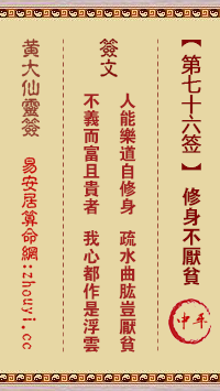 昔孔子食粗饭,饮水,枕手肱,不厌自己贫穷,仍然快乐,自修其身,不合义之富贵则视如浮云之无有,求得此签者,必要隐忍,受得艰辛,不可有厌气,且要乐心行善事,修身积德,要把定自己,不贪不谋,要能安贫乐道,始终无怨心,将来必有一番佳景,可预卜之,不用忧疑也。